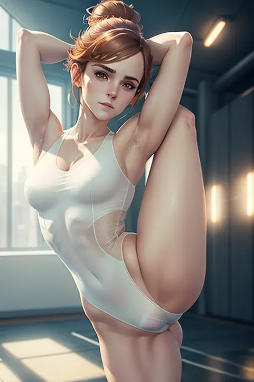 a concept photo of, flexible emma watson, in a gym, wearing a transparent white chiffon leotard, with visible erect nipples underneath her clothes, camel toe, updo hairstyle,shy, realistic eyes, small pupils, curved eyebrows, textured skin, flawless face, cgsociety, unreal engine, highly detailed, artstation, deviantart, sharp image, centered, volumetric lighting, hyper-realistic, back lighting, studio lighting,
