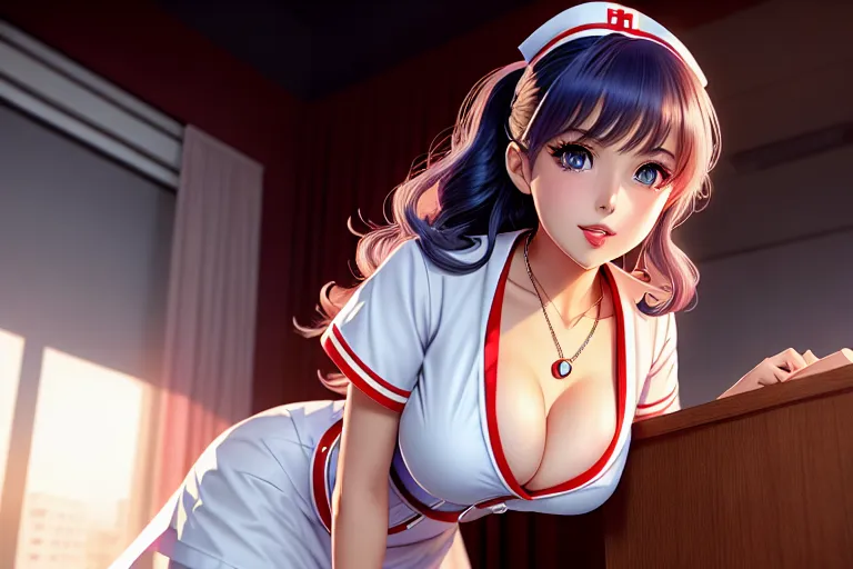 a color pencil draw of,an anime girl,wearing nurse clothes,shooting from a high point,at the office,natural breasts,five fingers per hand,wavy curtain bang,gorgeous face,beautiful lips,blue eyes,curved eyebrows,erotic,wearing necklace,cinematic lighting,editorial,bokeh,cgsociety,surreal