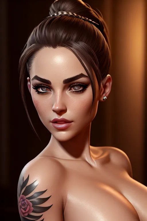 a digital painting of,yor forger,naked,at the party,small breasts,five slender fingers,ponytail,charming face,beautiful lips,detailed large eyes,curved eyebrows,curved eyelid,textured skin,tattoo,ultra realistic,unreal engine,studio lighting,artstation,sharp focus