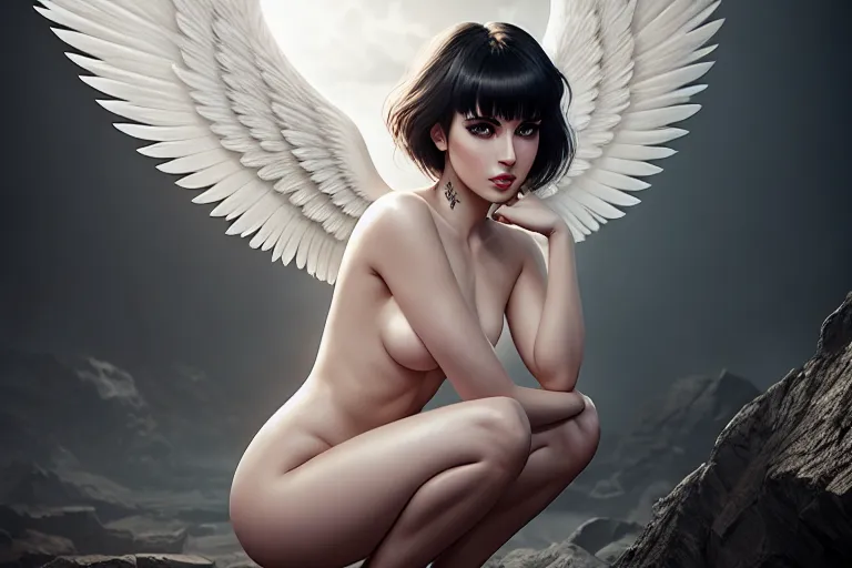 a digital painting of,an angel,naked,squatting,in a dystopian future,five fingers per hand,bangs hairstyle,gorgeous face,beautiful lips,black eyes,curved eyebrows,pale skin,satisfaction,tattoo,sharp focus,studio lighting,editorial,bokeh,ultra realistic