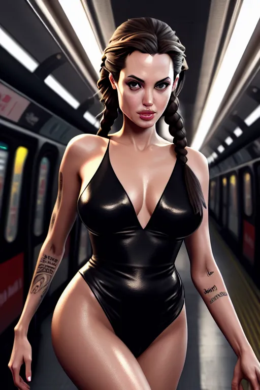 a illustration of,angelina jolie,naked,standing,in the london underground,small breasts,five slender fingers,braids hair,charming face,beautiful lips,black eyes,curved eyebrows,smooth skin,cosy,tattoo,8k,unreal engine,bokeh,artstation,cinematic lighting