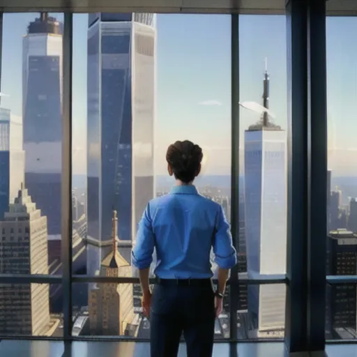 First person point of view, man looks out big glass windows and sees a 747 plane arriving, inside an office in ((world trade center tower on September elev... Created using Disney/Pixar in SD1.5 Text2Image mode. View and share this AI-generated artwork.