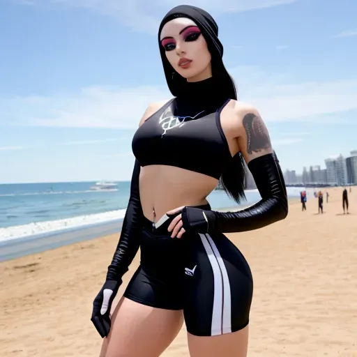 wide shot, 20 year old, an e-girl, athletic, goth clothes, black, beach, daytime, sunlight, happy, 8k, professional Created using PornV2 in SD1.5 Text2Image mode. View and share this AI-generated artwork.