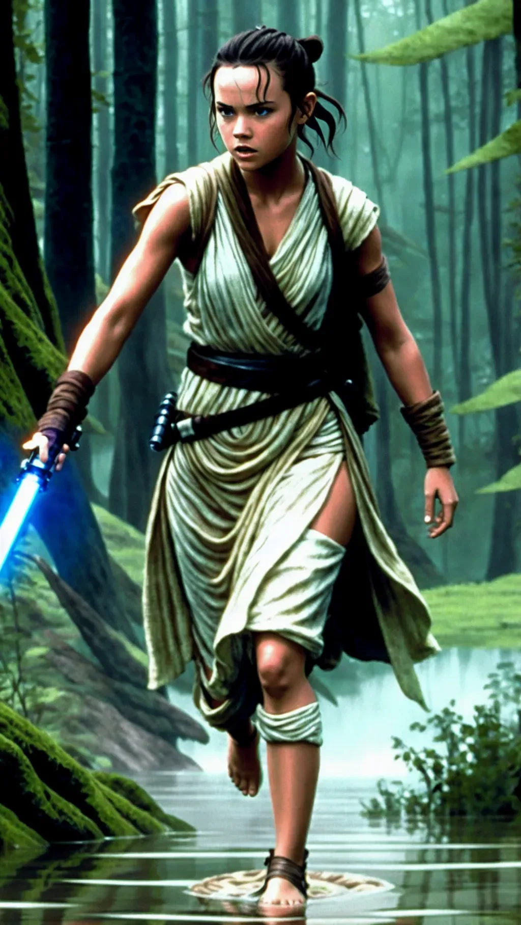 barefoot Rey Skywalker wearing her normal attire while holding her lightsaber and fighting in the flooded foggy Dagobah bog, barefoot, barefoot, barefoot,