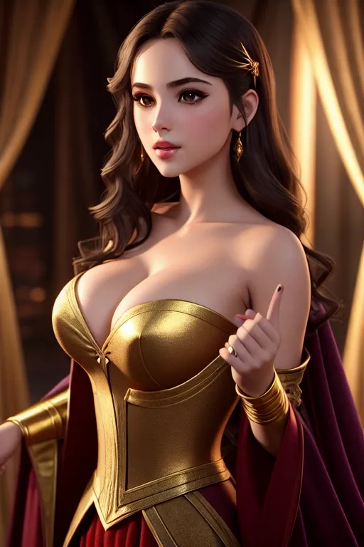 a digital art of,a young actress,wearing wizard clothes,touching breasts,at the party,small breasts,five fingers per hand,wavy curtain bang,charming face,beautiful lips,brown eyes,curved eyebrows,curved eyelid,pale skin,peaceful,wearing golden ring,sharp focus,unreal engine,bokeh,ultra realistic,studio lighting