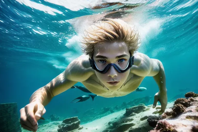 An extremely detailed photo of a blond haired, elegant, intricate, 10yo boy freediving deep below the surface underwater,he is swimming through an ancient ... Created using PhotorealismV1 in SD1.5 Text2Image mode. View and share this AI-generated artwork.