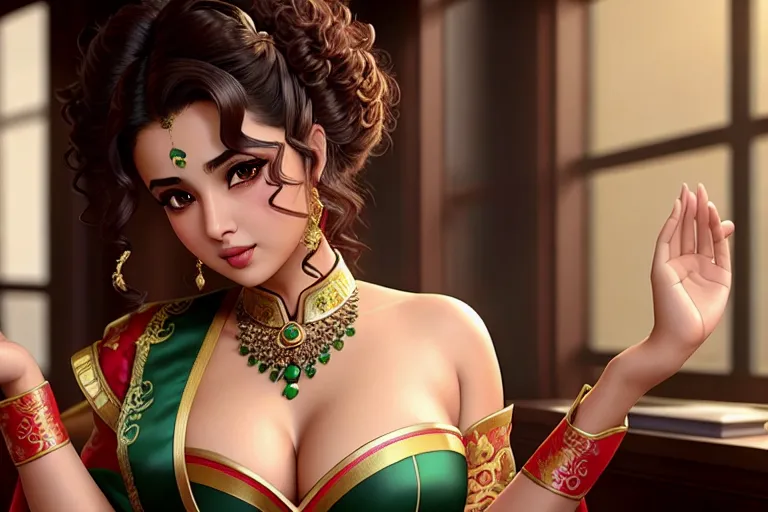 a concept art of,alia bhatt,wearing chinese costume,touching breasts,at the office,big breasts,five fingers per hand,curly hair,charming face,beautiful lips,green eyes,curved eyebrows,curved eyelid,cosy,tattoo,artstation,smooth,editorial,bokeh,unreal engine