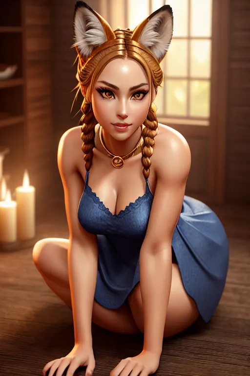 a digital art of,a nine-tail fox,wearing camisole,sitting on bent knees,indoor,five slender fingers,braids hair,gorgeous face,beautiful lips,blue eyes,curv... Created using Classic in SD1.5 Text2Image mode. View and share this AI-generated artwork.