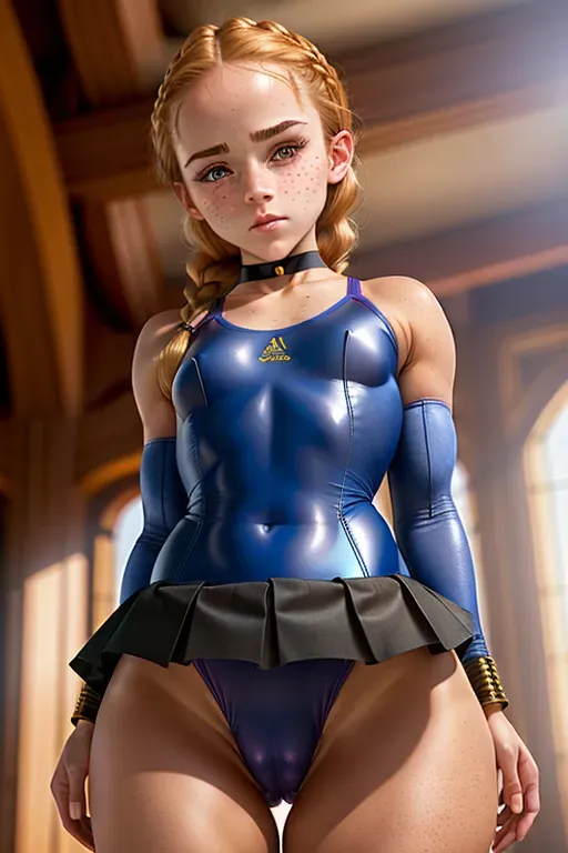 Hyperrealistic, ultra high definition photograph, focus on cameltoe, young Emma Watson, wearing an extremely tight spandex leotard with a very short pleated skirt, upskirt view, braids, tanned skin, plump lips, (cum face), freckles, choker, small breasts, perky nipples, tiny waist, flat stomach, cameltoe, thigh gap