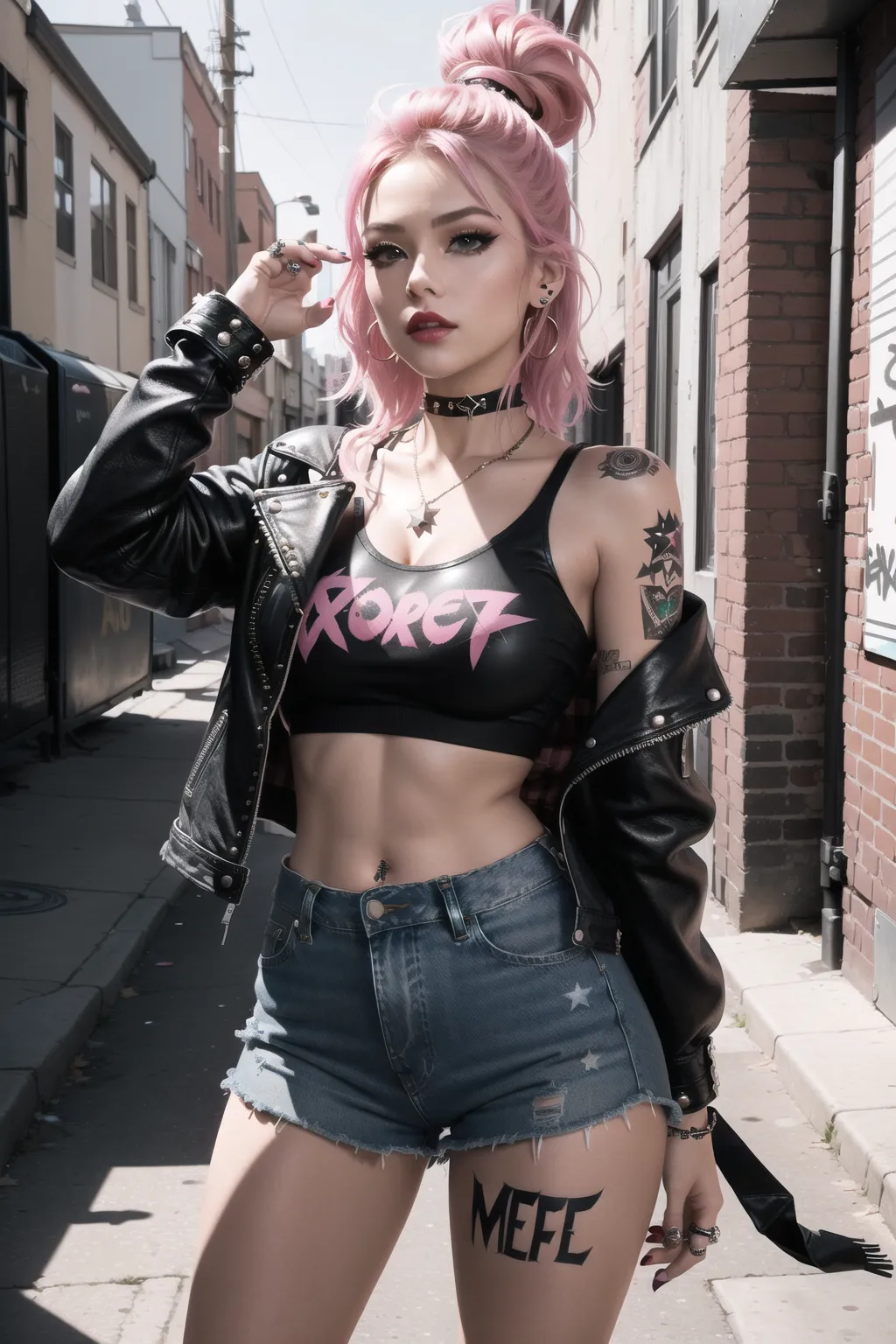 She is on the set of a music video, singing with passion and attitude. Her voice is raspy and rebellious, delivering the lyrics with a punk rock spirit. She wears a ripped denim jacket with patches and pins, over a red plaid shirt and a black tank top. She has black skinny jeans and red Converse shoes. She has a leather bracelet and a ring with a star on her right hand, a black choker, and a stud earring on her left ear. Her hair is short and blond, with pink highlights and a fringe. She has green eyes and a nose piercing, and she wears bright red lipstick and black mascara. The set is a graffiti-covered alley, with trash cans and broken bottles. The camera angles are dynamic and fast, capturing the energy and movement of the band and the singer. The music is loud and catchy, with catchy guitar riffs, fast drum beats, and catchy bass lines. The band members are beside her, playing their instruments with enthusiasm and style. They are also dressed in punk rock fashion, with leather jackets, jeans, boots, and accessories. They look like a fun and cool band, making music with their own rules and style. ((Lulu Chu)), ((confident expression)), ((((perfect hand anatomy)))), ((Artgerm Art Style)), ((no muscle tone)), (slender), ((medium breast)), ((perfect breast)), (hard nipples), ((Medium size Butt)), ((perfect supermodel body)), (soft body features), (perfect face), (perfect lips), (perfect eye shape), ((detailed eyes)), ((detailed face)), (performing sexy poses), ((((perfect hands)))), ((((perfect feet)))), perfect nipples, ((perky breast)), ambient lighting, soft shadows, natural shadows, light rays, particle effects, unreal engine, bokeh effect, ray tracing, cinematic, ultra sharp, clean lines, 14k, hyper-realistic, ((((detailed background))))