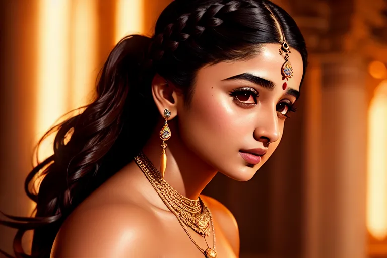a photograph of,alia bhatt,naked,in a temple,five fingers per hand,braids hair,beautiful face,beautiful lips,brown eyes,curved eyebrows,curved eyelid,smooth skin,romantic,wearing necklace,studio lighting,professional,artstation,smooth,sharp focus