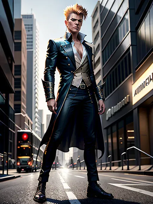 David Bowie modern day Wizard, , on a busy city street, dramatic lighting, hasrsh contrast of light and dark, Caravaggio style painting, full body portrait... Created using FantasyV1 in SD1.5 Text2Image mode. View and share this AI-generated artwork.