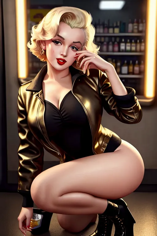 a oil painting of,marilyn monroe,wearing jacket,squatting,at the convenient store,amazing breasts,five slender fingers,bangs hairstyle,charming face,beautiful lips,black eyes,curved eyebrows,curved eyelid,textured skin,wearing golden ring,unreal engine,studio lighting,artstation,professional,sharp focus