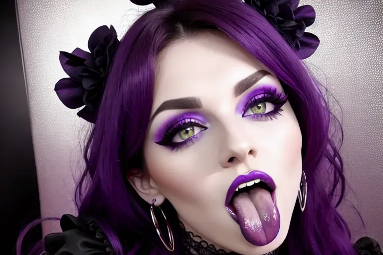 goth girl, revealing gothic clothing, beautiful body, detailed face, wide shot, bedroom, detailed eyes, dark purple hair, insanely beautiful, dpmg_awaitingtongue_v1,