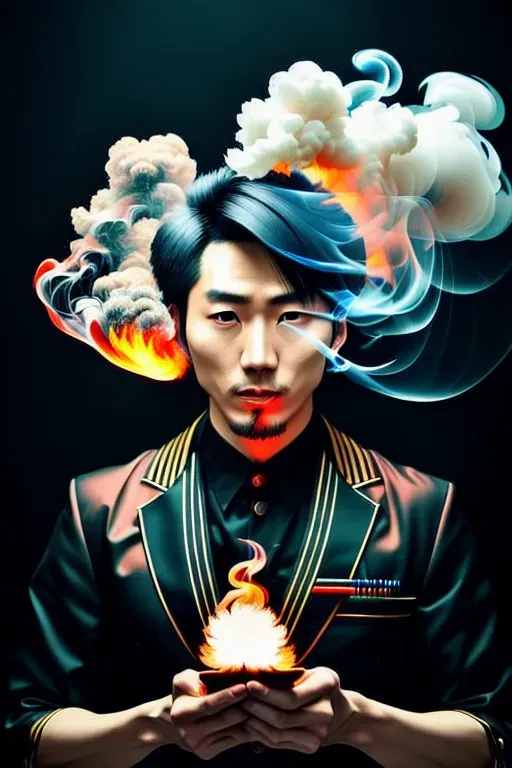 Photography of a Young Japanese man with his brain of fire with smoke,