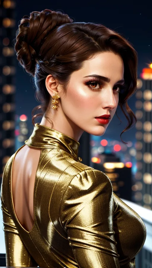 High-rise rooftop, bold young woman, city lights twinkling, Luminous Skin with Commanding Brown Eyes, a Strong Nose, and Confident Lips, Sky-high Updo, looking down, power and ambition, (dramatic close-up from a low angle)., from behind