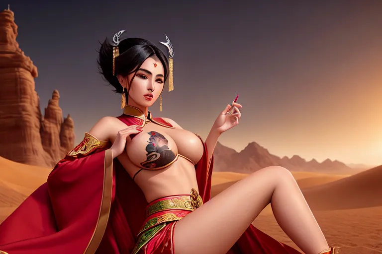 a digital painting of,a wizard,wearing chinese costume,kneeing,in the desert,amazing breasts,five slender fingers,short thick hair,beautiful face,beautiful lips,detailed large eyes,curved eyebrows,smooth skin,erotic,tattoo,editorial,smooth,8k,pixiv,studio lighting
