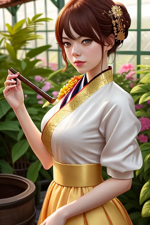 a illustration of,emma stone,wearing hanbok,shooting from a high point,in a lush greenhouse,small breasts,five fingers per hand,charming face,beautiful lips,brown eyes,curved eyebrows,textured skin,romantic,wearing golden ring,bokeh,professional,smooth,cgsociety,artstation